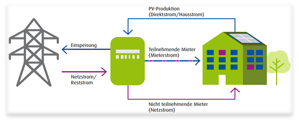 Verteilung des Stroms: Der erzeugte Strom wird über das hausinterne Stromnetz an die Mieter verteilt. Die Mieter können den Strom direkt nutzen, ohne dass er ins öffentliche Netz eingespeist werden muss.
